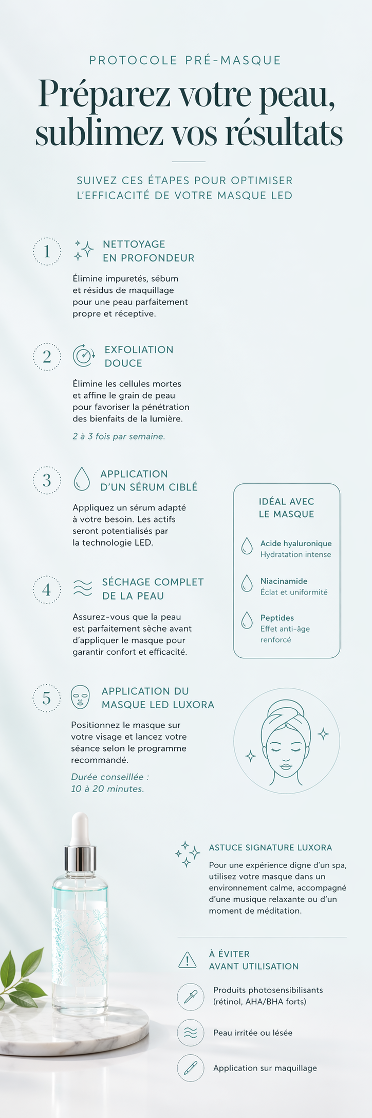 Conseil Luxora : les sérums à base de vitamine C ou d'acide hyaluronique potentialisent les effets du masque LED.